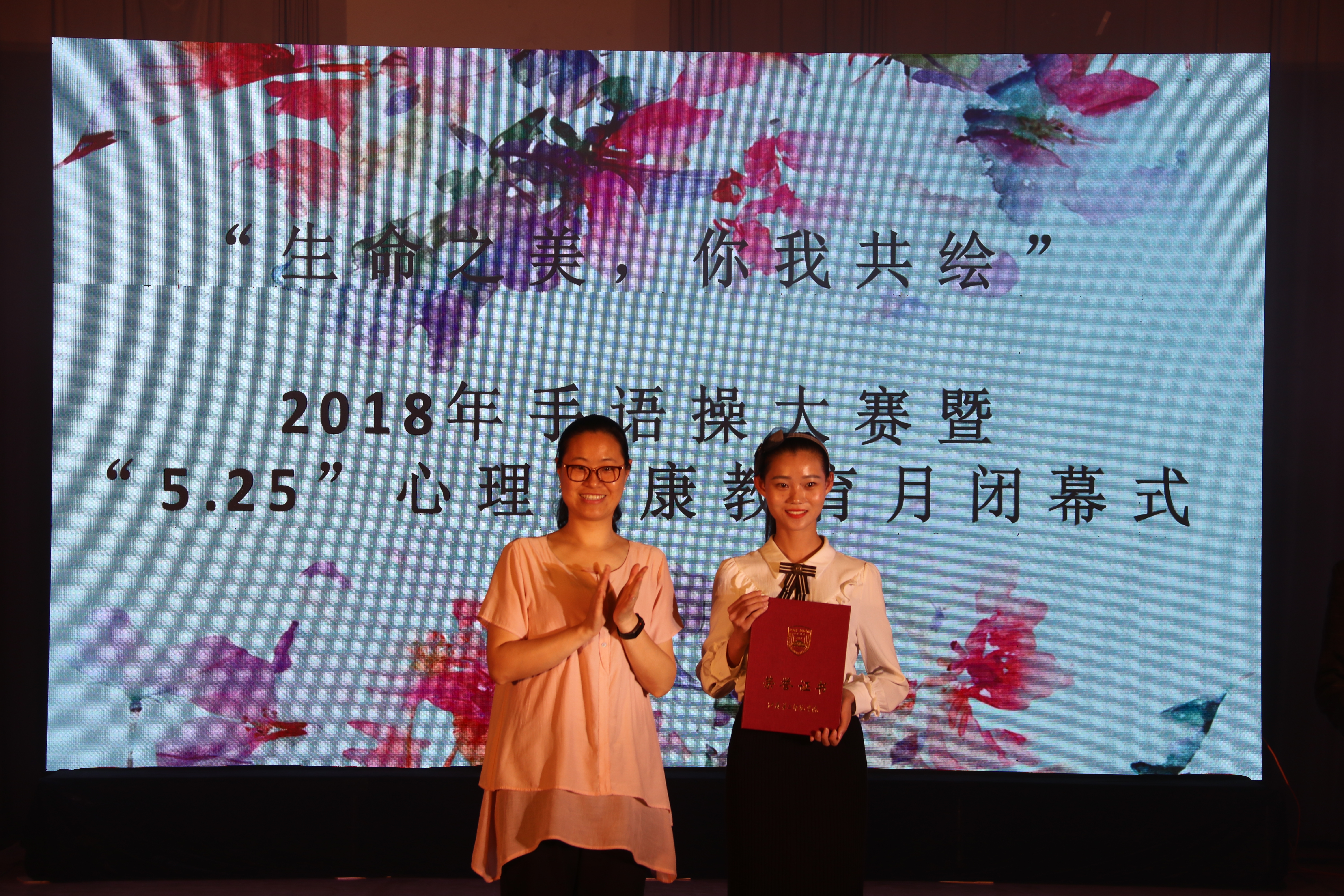 此次手语操大赛也是2018年“5.25我爱我”心理健康教育月的闭幕式。在此之前,心理健康月已组织了“分享你的仪式感”主题征集、“为你读诗”心理主题朗读、“家有一老 家有一小”照片征集、“抖动青春的音符”创意音乐短视频征集、朋辈互助心理团体辅导等一系列主题活动,在活动中引导学生关注自我健康、关注生命之美。