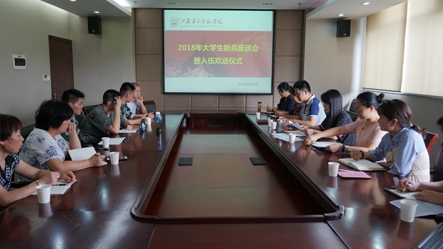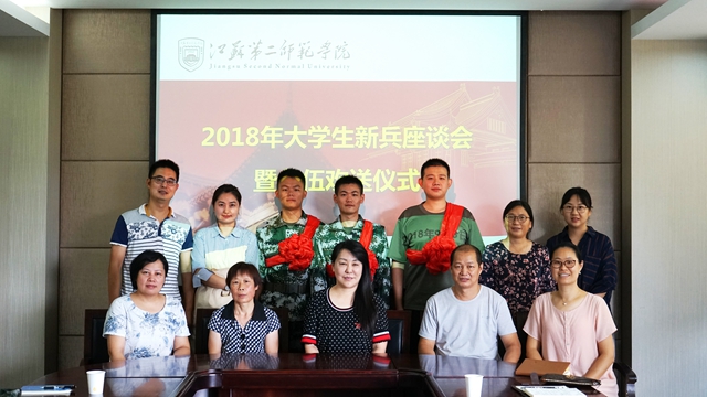 9月3日下午,我校在草场门校区举行2018年大学生新兵座谈会暨入伍欢送仪式,欢送即将奔赴军营的3名热血青年。副校长刘继红出席会议。学工处处长、人武部部长刘莹,学工处副处长、人武部副部长眭春良,生命科学与化学化工学院党总支书记陈建琴、数学与信息技术学院党总支副书记陈艳、生命科学与化学化工学院学工办主任朱琨、国防教育办公室副主任冯丽娜、3名新兵及家长参加会议。刘莹主持会议。