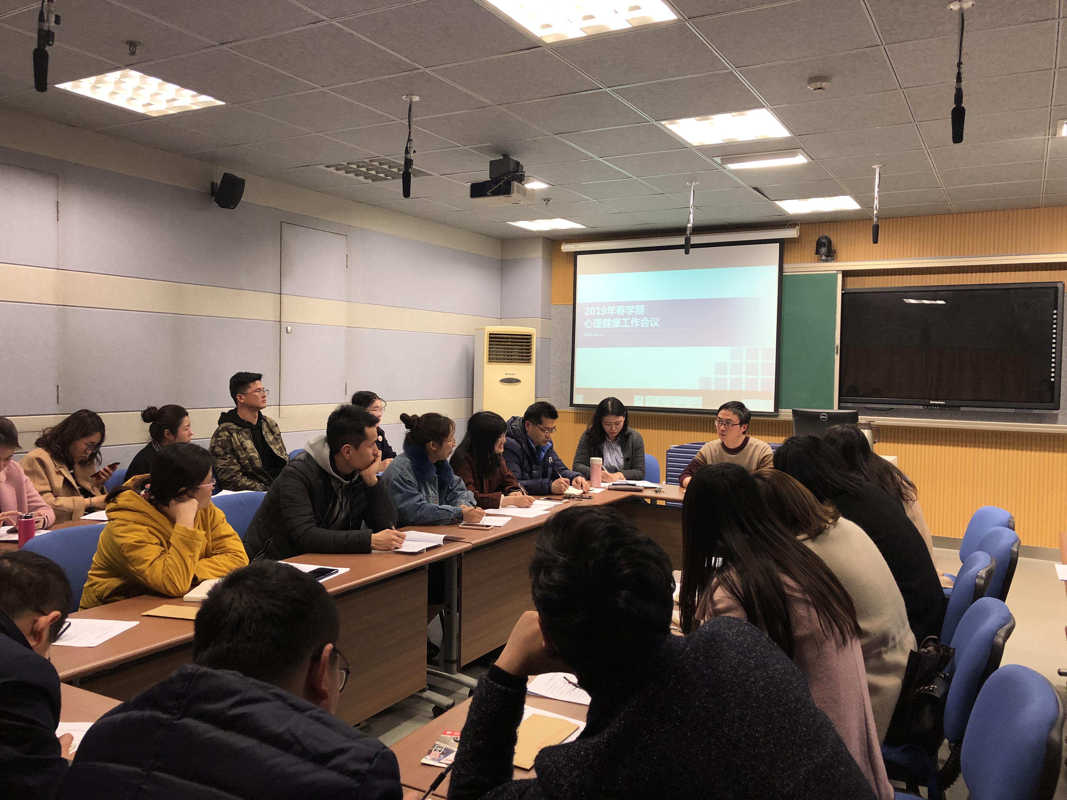 312日下午,学工处召开2019年春学期心理健康专题工作交流会,学工处副处长宋学军、大学生心理健康教育中心专职教师和全体辅导员参与了本次会议。