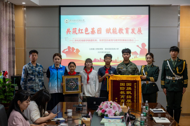 5月30日上午,江苏第二师范学院机关党委学工处党支部、质评处教发中心党支部、人文学部学生党支部、体育学院学生党支部、求真书院学生党支部联合南京市溧水区状元坊小学两个党支部开展“共筑红色基因 赋能教育发展”联学联建主题党日活动。正值状元坊小学六一表彰仪式,我校“一站式”国家安全教育学生社区“永葆橄榄绿 传承中国红”志愿服务团队也受邀参加此次活动。双方通过升旗仪式、国防课程、联建座谈等形式,深化红色教育,共探国防教育与教师发展融合新路径。