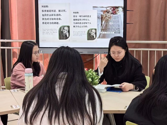在与孙盛老师的对话中,同学们从书里的哲思走向自己的生活:“怎么面对不被理解?”“如何改变自己的讨好型人格?”大家一边阅读、一边倾听彼此的经历,也开始重新思考“成为自己”的意义。许多原本难以启齿的问题,在讨论中变得不再孤单,许多不敢表达的心声,也终于有了出口。